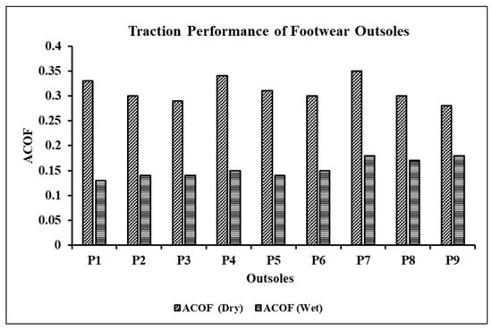 The ACOF of the outsoles, when tested mechanically in dry and wet conditions, ranged from 0.13 to 0.35 (Figure 6). In dry slip testing, the ACOF values varied from 0.28 to 0.35. P1, P4, and P7 showed similar and higher ACOF values compared to the other outsoles. The maximum difference in the ACOF in these outsoles was 0.01 where, P7 showed the highest ACOF (i.e., 0.35) followed by P4 (i.e., 0.34), and P1 (i.e., 0.33). P5 experienced a reduction of 12% in the ACOF compared to P7; whereas, P2, P6, and P8 showed an identical ACOF reduction of over 14%. P9 and P3 showed the lowest ACOF values of 0.28 and 0.29, respectively, compared to other outsoles. In wet slip testing, the ACOF values ranged from 0.13 to 0.18. Out of all the outsoles, P7 and P9 exhibited the highest ACOF value of 0.18 when slip tested on wet flooring. Additionally, P8 performed similarly to these outsoles with a maximum difference of 0.01 in the ACOF outcomes. Outsoles P2, P3, and P5 showed a similar ACOF with a reduction of 22% as compared to P7. P4 and P6 exhibited an ACOF of 0.15; whereas, P1 exhibited the lowest ACOF of 0.13.