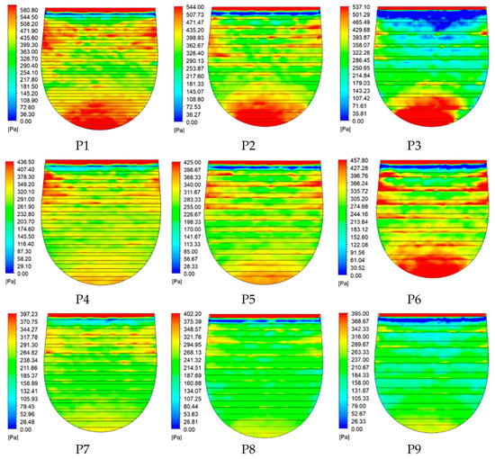The peak gauge fluid pressures induced on the outsoles of the footwear varied from 395 Pa to 580.80 Pa. Figure 7 presents the induced fluid pressure contours on the outsole models. Outsole P1 exhibited the highest induced pressure (i.e., 580.80 Pa) compared to other outsoles. The pressure was approx. 1.5 times higher than P9, which exhibited the lowest induced fluid pressure (i.e., 395 Pa). Outsoles P1, P2, P3 showed similar fluid pressure contours having values 580.80 Pa, 544 Pa, and 537.10 Pa, respectively. Outsoles P4, P5, and P6 showed a pressure reduction of 24% to 30% as P4 experienced 436.50 Pa, P5 experienced 425 Pa, and P6 experienced 457.80 Pa. Furthermore, P7, P8, P9 exhibited the lowest fluid pressures ranging from 395 Pa to 402.20 Pa. P7 showed a fluid pressure of 397.23 Pa, P8 showed 402.20 Pa, and P9 showed 395 Pa with distributed and limited localized zones.
