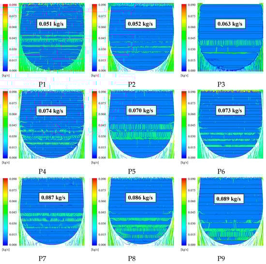 Figure 8 presents the average mass flow rates across the outsoles during the wet slip testing simulations. The flow rates across the footwear outsoles ranged between 0.051 kg/s and 0.089 kg/s. Out of all the outsoles, P9 exhibited the maximum mass flow rate of 0.089 kg/s throughout the topography. On the contrary, P1 reported the lowest mass flow rate of 0.051 kg/s, across its treads, during the wet slip simulation. Outsole P2 reported a similar flow rate (i.e., 0.052 kg/s) as compared to P1, which showed difficulty in streamlining the water flow through their treads. Besides P1, P2, P3, the remaining outsoles exhibited increased mass flow rates in the ranges of 0.070 kg/s to 0.089 kg/s. The highest mass flow rates were for P7 with 0.087 kg/s, P8 with 0.086 kg/s, and P9 with 0.089 kg/s.
