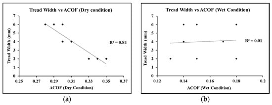 Effect of tread width on ACOF: (a) in dry condition and (b) in wet condition.