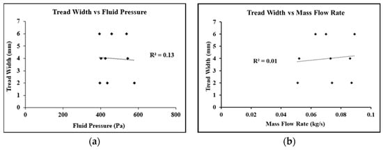 In wet slipping simulations, the effect of varying tread width on fluid pressure and mass flow rate were assessed by estimating the quality of correlations between them (Figure 10). Tread width and fluid pressure were found to be weakly correlated (R2 = 0.13) (Figure 10a). Fluid pressure across each width ranged from 395 Pa to 580.80 Pa and no localized zones were formed. Similarly, tread width and mass flow rate were reported to be weakly correlated (R2 = 0.01) (Figure 10b). Mass flow rates were distributed across the outsoles and no significant trends were observed.