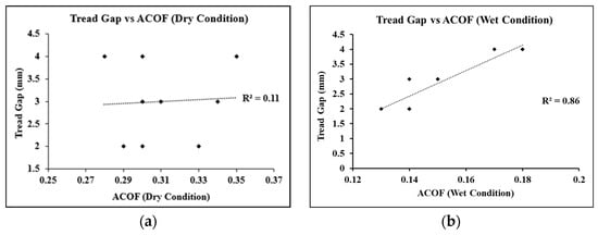 Effect of tread gap on ACOF: (a) in dry condition and (b) in wet condition.