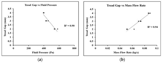 In wet slipping simulations, the effect of varying tread gap on fluid pressure and mass flow rate were quantified by estimating the quality of correlations between them (Figure 12). Tread gap and fluid pressure were reported to be strongly and negatively correlated (R2 = 0.90) (Figure 12a). Fluid pressures across a gap of 2 mm were in the range 537.10 Pa to 580.80 Pa, a 3 mm gap ranged from 425 Pa to 457.80 Pa, and a 4 mm gap varied from 395 Pa to 402 Pa. Similarly, tread gap and mass flow rate were reported to be strongly and positively correlated (R2 = 0.94) (Figure 12b). Flow rates across a gap of 2 mm were in the range of 0.051 kg/s to 0.063 kg/s, a 3 mm gap ranged from 0.070 kg/s to 0.074 kg/s, and a 4 mm gap varied from 0.087 kg/s to 0.089 kg/s.