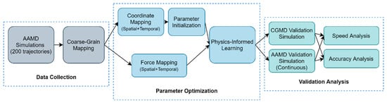 Our physics-informed CG modeling follows a multiscale approach, characterized roughly by the transfer of high resolution AA data to the CG scale through the parameterization of a CG model [25]. The approach is shown in Figure 2. In the first box of “Data Collection,” spatial and temporal mapping schemes are employed to map the AAMD simulations to the reduced-resolution CG structure, representing the ground truth. In the second box of “Parameter Optimization,” a new CG force field is parameterized to conform to this ground truth. This is carried out by first employing IBIM on the bonded parameters [26,27], which iteratively scales parameters and simulates trials to match the reference radial distribution function (RDF). Visual Molecular Dynamics (VMD) software is used to initialize the non-bonded terms [28] based on approximated values and solvent-accessible-surface area (SASA) calculations [29]. In the last box of “Validation Analysis,” the learned parameters are implemented in a CGMD to corroborate the proposed method with the baseline reference. The simulations are evaluated in terms of simulation accuracy and computation speed. Specific details are provided in the following sections.