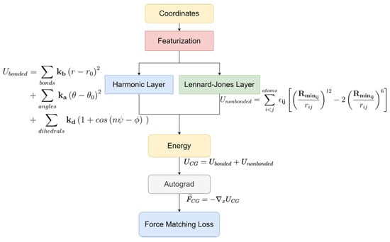 A force-matching approach helps preserve thermodynamic consistency by minimizing the error between the instantaneous ground-truth forces and predicted forces [19,20,29,30]. Our PIML model defines its trainable parameters as the CG force field parameters. The CG coordinates serve as the input to the model, and the model further predicts the total potential energy of the system. All physically relevant invariances are thus preserved. Leveraging an automatic differentiation function, we take the negative gradient of this energy with respect to the input coordinates, and thus effectively obtain the instantaneous predicted forces. The task is thus to learn the parameters to minimize the error between these predicted forces and ground-truth forces in the loss function.
