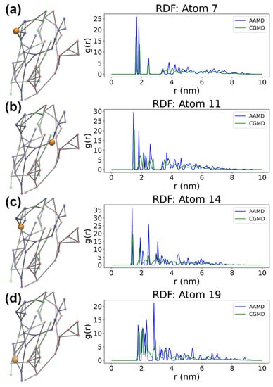 RDF plot from single reference atom comparison of the CGMD simulations vs. the AAMD validation simulations. In the colored beads visualizations: blue—chain A; red—chain B; green—chain C; orange—selected atoms. Spearman’s correlation coefficients: (a) 0.7472; (b) 0.6560; (c) 0.6278; (d) 0.5690.