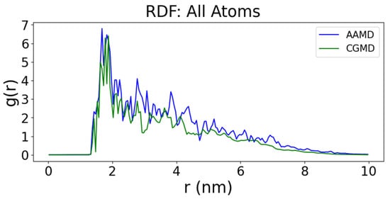 RDF plot of all atoms for comparison of CGMD vs. AAMD. Spearman’s correlation coefficient: 0.9692.