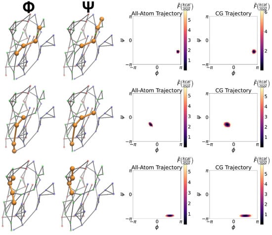The torsion angle distribution can be plotted to depict the unimodality in Figure A1 and thus confirm the choice of n = 1 as the multiplicity for the periodic representations. The distributions in Figure A1 present more common conformations with the yellow color, where the means are the respective equilibrium states. While quadratic, or n = 0 representation also fits this unimodality, we understand that long-term secondary structural changes are unlikely to be modeled properly with this quadratic dihedral form. Thus, we favor the use of the periodic form, which lends itself to more flexibility in case of additional states.
