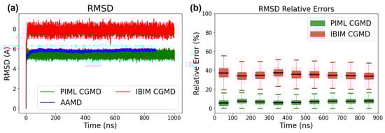 The RMSD relative errors are included as well. Each error bar is normalized and extracted for statistics within a time period of 100 ns. All three simulations plotted below start with the same structure, and the relative error represents the relative error of our PIML and IBIM methods, respectively, with respect to the AAMD structures throughout their CGMD simulations. The calculation for such relative error is defined below: