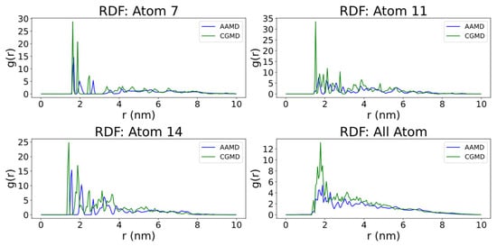 To quantitatively measure the accuracy of the RDF plots, we incorporate Spearman’s correlation coefficient [32] to measure the correlation between the CGMD and reference AAMD RDF plots. In Figure 5 and Figure 6, the Spearman’s correlation coefficients for each RDF plot are 0.7472, 0.6560, 0. 6278, 0.5690, and 0.9692 for atoms 7, 11, 14, and 19 and all atom pairs, respectively. This incorporation of a quantitative metric of Spearman’s correlation coefficient confirms this reasonable correlation in Figure 5, and strong overall correlation in Figure 6.