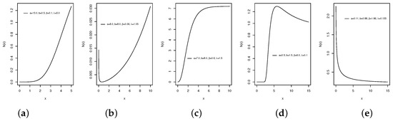 Sample of plots of the hrf of the NEKwE distribution: (a) increasing convex shape, (b) U shape, (c) increasing concave shape, (d) reversed 1 shape, and (e) decreasing shape.