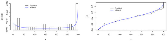 We see in Figure 1 that the NEKwU distribution is flexible in terms of pdf and hrf curvatures. In particular, the pdf may have decreasing, unimodal right-skewed, unimodal near-symmetrical, and U shapes. These properties are generally desirable to model lifetime phenomena with such bounded value characteristics.
