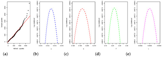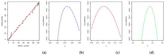 where is the qf of the baseline distribution . The closed form of the qf is a convenient way to generate quantiles and random data from the NEKwG models; the median, on the other hand, is given by (see [45]). The skewness and kurtosis of the NEKwG family can be studied from the standard quantile measures called Bowley’s skewness (see [46]) and Moor’s kurtosis (see [47]).