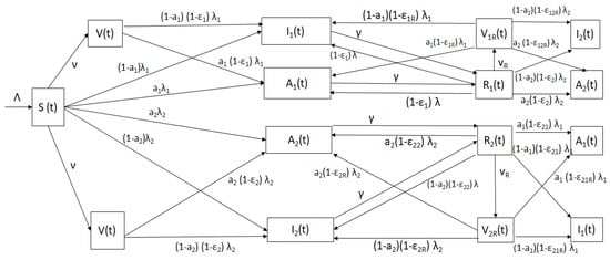 The model encompass individuals in the susceptible (), symptomatic (), asymptomatic () and recovered () groups for each SARS-CoV-2 strain. In addition, the model comprise three type of subclasses for vaccinated individuals. The first is when susceptible individuals are vaccinated , the second when individuals who have recovered from strain 1 get vaccinated , and the last arises when individuals who have recovered from strain 2 get vaccinated . The individuals in the last two subpopulations have stronger immunity and protection against the SARS-CoV-2, as immunology studies have suggested [57]. The model is depicted in Figure 1.