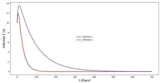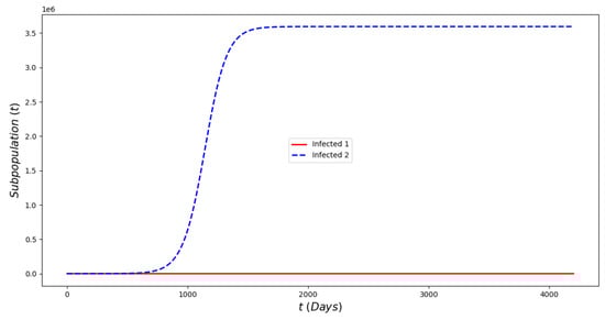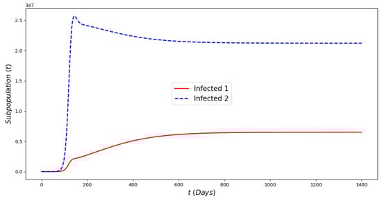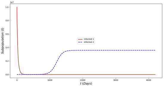 Figure 2 displays the evolution of the symptomatic subpopulations and . We chose the transmission rate such that and . Both symptomatic (the asymptomatic cases were also treated but are not shown) subpopulations approach the disease-free steady state . In order to obtain manageable and useful graphs for the steady states we use a large natural death rate for faster dynamics only in this subsection. Figure 3 displays the long-term behavior when and the initial infected subpopulations are small. Note that the Omicron strain becomes the prevalent one and the previous circulating one vanishes. In Figure 4 we consider the case where the initial number of infected people with the previously circulating strain is large in order to resemble reality when Omicron was introduced. It can be seen that despite having a large vaccination rate, the system (2) still approaches the endemic steady state due to the higher transmissibility of the Omicron strain. Figure 5 depicts the case where and it can be seen that the previously circulating strains and the Omicron strain become endemic. The explanation for this is due to the fact that people who got either of the SARS-CoV-2 strains can get the other strain. After this long-term dynamics results, the next subsection is devoted to the transient dynamics of the Omicron wave.