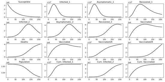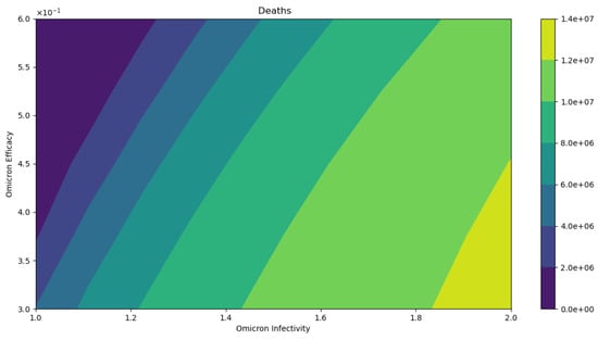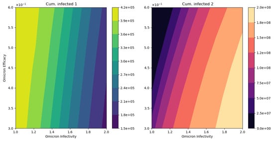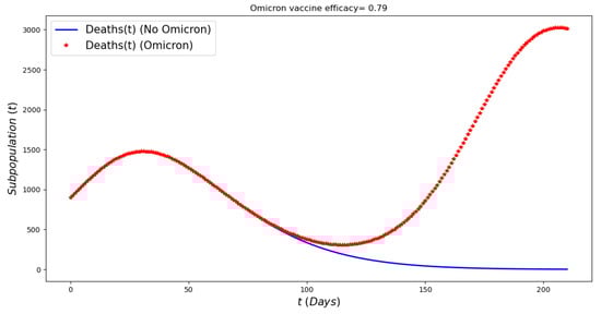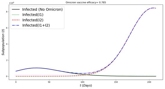 Figure 6 displays the paths of each of the subpopulations and some cumulative numbers. This is a particular case where we can see the evolution of the Omicron wave for one scenario. This is not a suitable way to understand the effects of the Omicron strain since there is no comparison with other scenarios. Thus, the next simulations consider variations of the vaccine’s efficacy against Omicron and also Omicron infectivity.