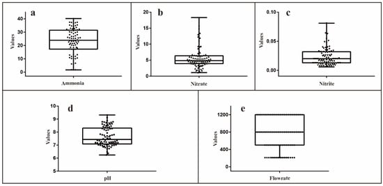A statistical analysis of the processed data was performed for (a) ammonia, (b) nitrate, (c) nitrite, (d) pH, and (e) flowrate.
