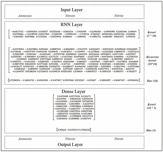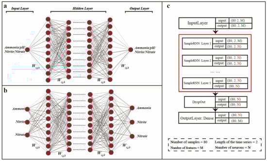 Figure 2a,b present the one-to-one and three-to-three RNN architectures. Figure 2c presents the design scheme of the RNN model. In the one-to-one model, one of the inputs, for example pH at t = 1 and 2 h, was used to predict the subsequent output at the following time interval, which was pH at t = 3 h. Meanwhile, three inputs (ammonia, nitrate, and nitrite) at a specific time were used to estimate the subsequent outputs in the three-to-three model. This means that ammonia, nitrate, and nitrite at t = 1 h and 2 h served as the inputs for ammonia, nitrate, and nitrite at t = 3 h.