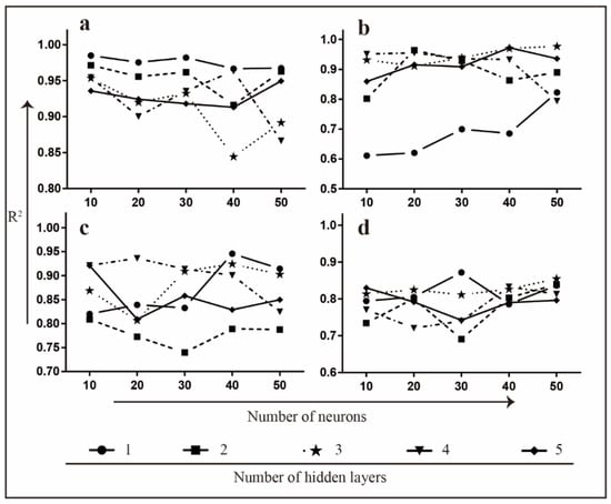 Figure 3 shows the prediction results of the one-to-one model for (a) pH, (b) ammonia, (c) nitrate, and (d) nitrite. In Figure 3a, when the number of hidden layers is 1, the R2 value is almost not affected by the number of neurons. However, as the number of hidden layers increases, the R2 value decreases. It could be clearly observed in the model, which consisted of 3 hidden layers and 40 neurons, where the R2 was equal to 0.844, while the model with a single layer and 40 neurons has a R2 value of 0.966. This could be due to the fact that the change in pH was not significant during the nanoFeCu-triggered ammonia oxidation process, as shown in Table 2, where the SD value of pH is 0.816. This indicates that a single layer is sufficient to develop a good model to predict the pH. A similar trend was observed in the nitrite model, where a small SD value of 0.014 was observed in Table 2, and Figure 3d showed that a single layer was good enough to predict its performance with a high R2 of ~0.8. The best nitrite prediction was found in the model with a single hidden layer, 30 neurons, and an R2 value of 0.872.