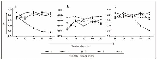 In Figure 4, for a single hidden layer, the added neurons decrease the R2 value of the model, especially in Figure 4a,b. This could indicate that the increasing number of neurons leads to the risk of overfitting the model. It is noteworthy that the change in neurons from 10 to 50 did not cause a dramatic change in R2 values when the number of hidden layers was increased from 1 to 5, as shown in Figure 4a,b. This suggests that when the hidden layer is small, even increasing the number of neurons may not lead to better prediction results. The best R2 predictions for ammonia, nitrate, and nitrite were 0.961 with 5 layers and 30 neurons, 0.940 with a single layer and 50 neurons, and 0.941 with 5 layers and 20 neurons, respectively. In addition, the three-to-three model predicted ammonia, nitrate, and nitrite well with an R2 value of > 0.9, except for the results of the single hidden layer.