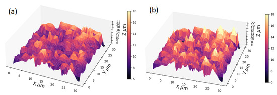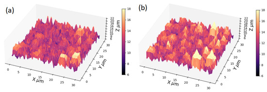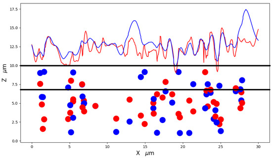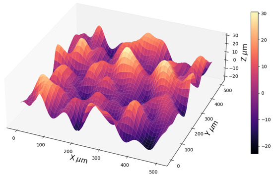 Two random surfaces were considered. One involved a higher correlation length ( = = 2 μm, isotropic surface) in order to obtain a smoother surface as shown in Figure 6. A second surface with a lower correlation length ( = = 0.4 μm, isotropic surface), which makes the surface noisier, was also simulated. This last one, however, allows us to identify on the surface those regions below which the particles are located. The RMS height values were both 2 μm. Surface deformations were performed using the methodology described in the previous section, using 400 points for the initial grid, which subsequently increases in size due to the particles, obtaining a final grid of 463 points. The results of test 1 are shown in Figure 6, the results of test 2 are shown in Figure 7 and Figure 8. The calculation of the RMS roughness parameter was performed using the following expression (standard deviation of heights) [24]: