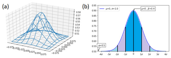 where is the height where the Gaussian bell begins, is the maximum bell height, x, y are the positions of the center of the bell, and is the standard deviation which is the same as the radius of the particle lying below the bell. The bell grows proportional to the change in height, that is, the greater the change in height the larger the size of the bell; therefore, the parameter is dependent on this change, where this is taken as the value of the change in height of the particles. Since the complete graph comprises flattened portions beyond three times the standard deviation, a suitable cut-off was chosen to be among the limits from to as shown in Figure 2, so as not to affect the surface too much. This model allows the creation of peaks and valleys in the z direction, if the displacement of particles is either positive or negative.