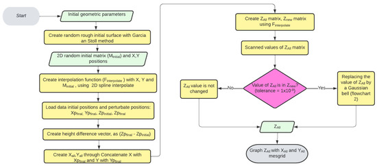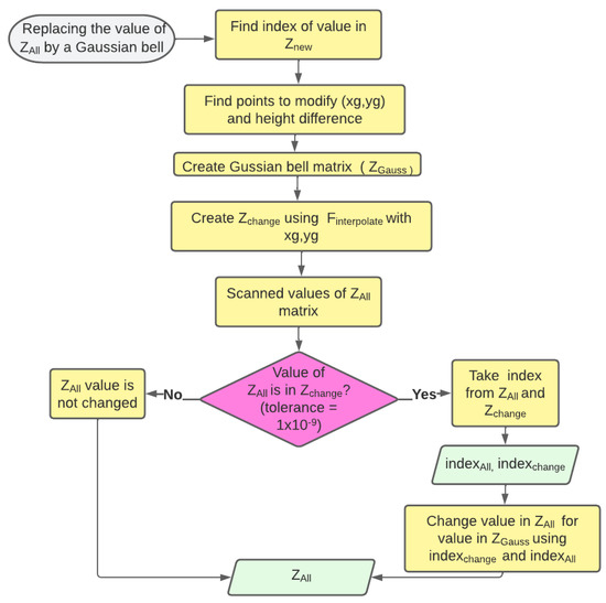 The process to achieve this is as follows: First, the initial mesh positions (x, y) are concatenated with the final positions of the magnetic particles generating all the necessary points to modify the surface. Then, using the interpolation function, two matrices are generated, the matrix using the and positions, which will be the basis for the rest of the algorithm, and the matrix using and positions, with the purpose of identifying these positions in the matrix, to generate the deformation through a Gaussian function. As mentioned above, the displacement of the particles generates the deformation, therefore it is necessary to create an array that contains these values; in this case, the displacements in the z direction are stored. These are calculated as the difference between the initial and final locations of each particle, named as Z, which corresponds in turn to the parameter in Equation (2). This methodology is summarized in Flowchart 1 in Figure 3, showing data processing from the creation of the surface to the modification of it; however, in the binary execution step, where and are compared, it is necessary to deepen its operation. In this step, if the decision is “Yes”, we proceed to the methodology of the replacement of the area affected by the particle movement, as summarized in Flowchart 2 in Figure 4. Taking into account the large number of steps involved in the modeling, Flowchart 1 integrates all the variables and matrices necessary for the creation and subsequent modification of the surface, whereas Flowchart 2 specifies the way in which these variables and matrices will be used to generate the modification in specific regions of the surface, more concretely, those local zones influenced by the presence of particles underlying the surface. To achieve this, we proceed as follows: