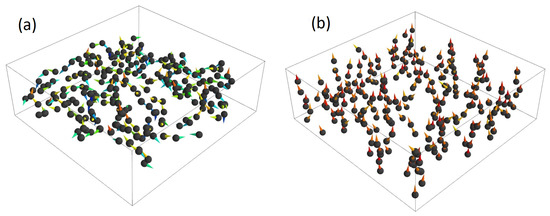 Three-dimensional elastomer-magnetic particle system, the color is associated with the z-component of spin. (a) System before applying magnetic field. (b) System after applying magnetic field.