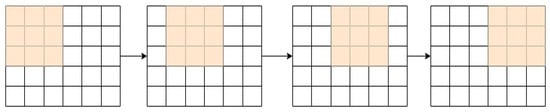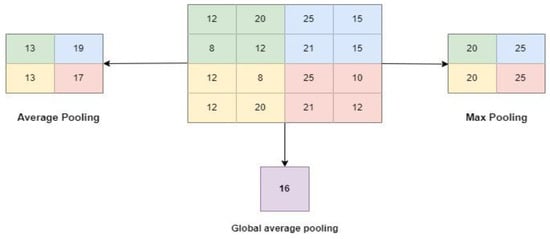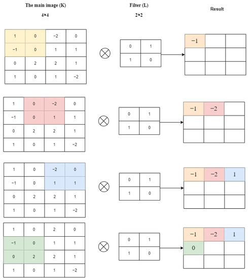 In fact, the values of the dot product indicate the feature map of the output. Figure 3 visually represents the primary calculations performed at each stage. In this diagram, the smaller square (2 × 2) represents the kernel, while the larger square (4 × 4) represents the input picture. A product is then presented as a number after multiplying by both, and this sum provides an input value for the output feature map [15,16,17].