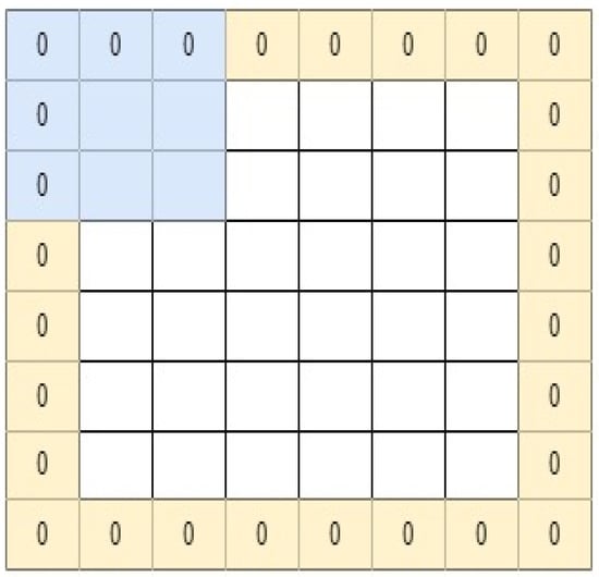 where P is the number of the layers of the zero-padding (e.g., P = 1 in Figure 7), We can avoid network output size from decreasing with depth by using this padding concept. Consequently, any number of deep convolutional networks is feasible [21].