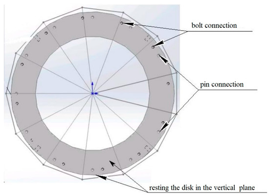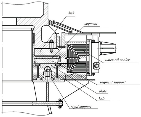 Figure 1 shows the design of the thrust bearing on adjustable screw supports [1]. The thrust bearing is located in an oil bath with water-oil coolers. The moving part of the support structure consists of a hub, which is mounted on the upper end of the shaft, and a ring into which the segments are inserted. The lower part of the hub is equipped with a disc with a polished surface, namely a mirror of the thrust bearing. All the vertical load is transmitted through the mirror of the bracket to the segments. The segments of the thrust bearing are arranged in one or two rows on the rest seat of the thrust bearing that accepts the load. The steel segment consists of the body of the segment and a cushion covered with a layer of anti-friction material, namely babbit or fluoroplastic. The segment rests on a plate (segment support), which is supported by spherical heads of bolts, which ensure their self-installation during operation. To prevent rotation (turning), the segments are held by special radial rests.