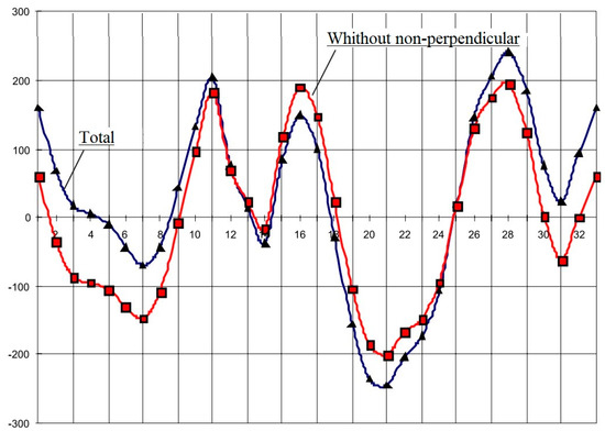 Since the surface of the disc with clearly expressed defects interacts with the fluoroplastic coating of the heel segments, the friction force Ftr = 16000 N, the friction coefficient ƒ = 0.0001 (actual 0.05) appears accordingly. In the calculation, it is assumed that the defects are located at a uniform distance from each other and do not have mutual influence (see Figure 3).
