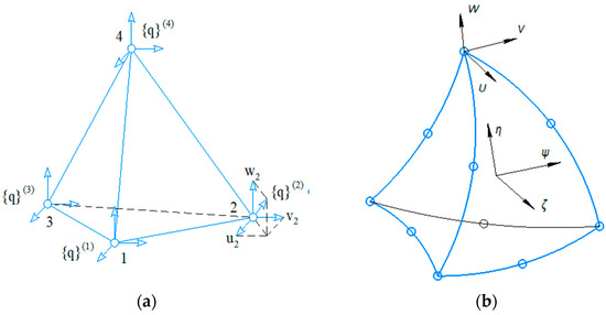 One of the defining moments in solving finite elements method problems is the choice of a finite element. Two types of tetrahedrons (Figure 4) with different approximations of movements inside the element are used as basic finite elements. The first tetrahedron has units at the vertices (Figure 4a) and is based on a linear approximation of movements inside the element, and the second is an oblique tetrahedron that has units at the vertices of the element and in the middle of its ribs; it is based on a quadratic approximation of movements inside the element (Figure 4b).