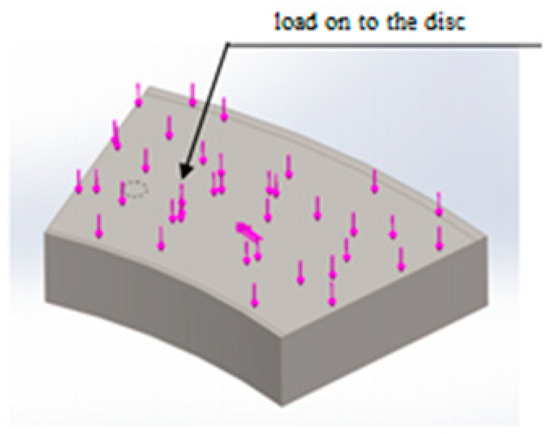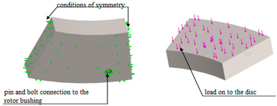 Symmetry conditions are set on the face end surfaces of the disc segments to simplify modeling. For all defects, forces are set on the contact surface of the disc in the area of defect development. The disc-surface contact of the segment is specified as forces. At the same time, the calculation coefficient of friction in a pair (disc-fluoroplastic through oil film) according to the methodology of JSC “Ukrainian Energy Machines” is 0.05, and defects make up a very small part of the total mirror surface; then the accepted coefficient of friction for end forces is taken equal to 0.0001.