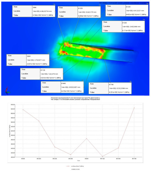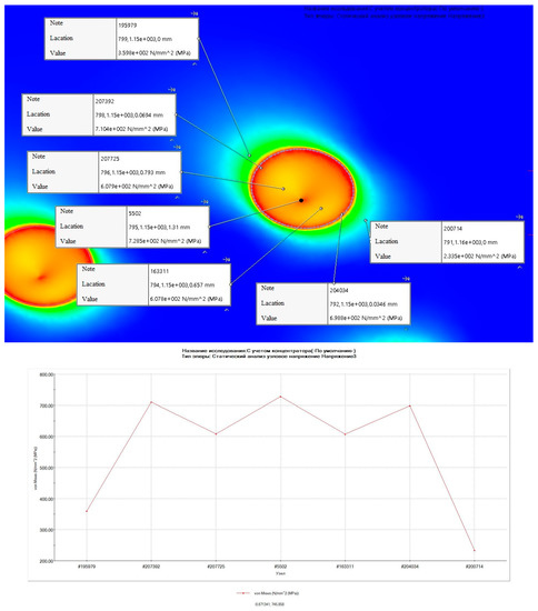 According to the obtained results, the average stress along the mirror surface of the disc comprises 50 MPa. In the defect location zone, the maximum stress is 728 MPa and the average stress is 500 MPa. These values exceed the strength limit (470 MPa, according to DSTU 9182:2022), yield strength (245 MPa, according to DSTU 9182:2022), and permissible stresses for rotating parts (233 MPa, according to IEC 60034-33:2022) [18,20].
