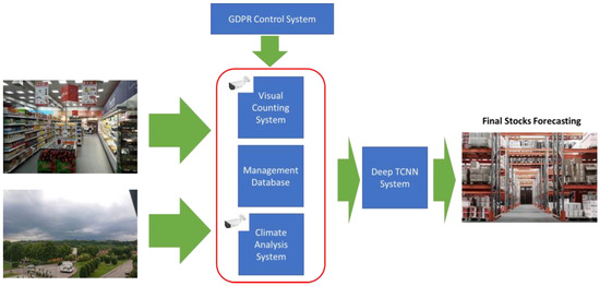 As described in Figure 1, the proposed system is composed of different subsystems which provide input data to the downstream “Deep TCNN System” (which embeds a TCNN) suitable to provide the prediction of the final stock amount of the analyzed commodity. The designed subsystems are: “The Visual Counting System” which will make a daily count of the customers present in the market store (using a computer vision approach) and, therefore, reconstruct an average of the customers who have frequented the store in a specific period. After that, there is the “Management Database” which has the target of providing historical information relating to the purchase, sale, and orders of the product whose future final stock is to be predicted. Finally, there is the “Climate Analysis System”, which provides information on the climate in the last period and in the context of the store. This multimodal information will then be fed as an input to the deep TCNN system which has the task of correlating these data with the final stock of the product after a certain number of days. This TCNN system is based on a temporal causal–convolutional backbone with self-attention layers, as better described in the following subsections. Each of the described blocks will be detailed in the following paragraphs.