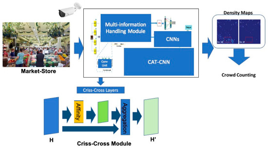 As reported in Figure 2, the designed model embeds a classical pipeline for visual feature extraction for computing density maps from which it retrieves a crowd count. Moreover, a self-attention mechanism based on criss-cross processing was added in order to improve the overall performance of the implemented pipeline. To capture the video frames of the market store, the authors propose using the surveillance cameras normally installed in shopping stores. The frames thus obtained have to be corrected in projection to optimize the performance of the designed method.