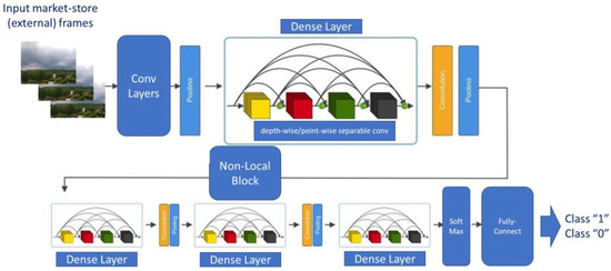 The target of this block is the local average climatic characterization of the geographical area in which the market store is located. In order to characterize this aspect, a 3D-DCNN enhanced with nonlocal self-attention layers was proposed [65]. The input of the designed 3D-DCNN will be the time–depth video frames captured by the outside (of the shopping store) visual system in specific time instants. In this work, the authors proposed the capturing of a visual snapshot of the outside of the market store in the morning (at 08.00 am) followed by a second, sampled at 12.00 am, and, finally, in the afternoon at 5.00 pm. In this way, it will be possible to characterize the climate of the local geographic area where the shopping store is located.