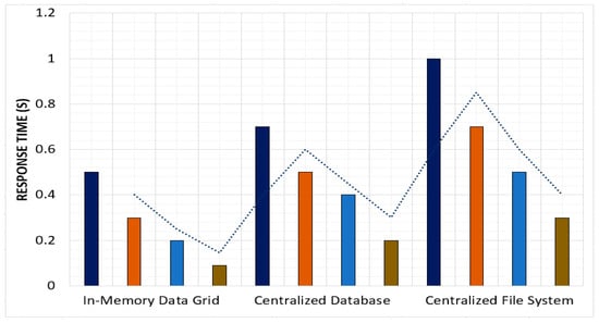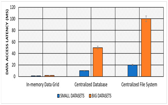 Data Access Latency: The in-memory data grid approach significantly improved data access latency compared with the centralized database and centralized file system approaches. The in-memory data grid approach was able to reduce data access latency by up to 90% for both the small and large datasets, which are described in Table 3. The results of the average data access latency of small and large datasets for different approaches are shown in Table 4 and Figure 1.