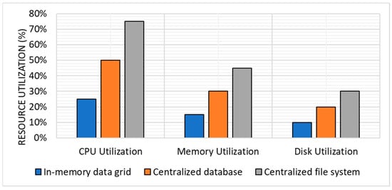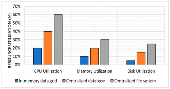For scheduling tasks, the in-memory data grid approach had an average CPU utilization of 25% and memory utilization of 15%, and disk utilization of 10%. The centralized database approach had an average CPU utilization of 50% and memory utilization of 30%, and disk utilization of 20%. The centralized file system approach had an average CPU utilization of 75%, memory utilization of 45%, and disk utilization of 30%. Figure 3 shows the average scheduling for resource utilization.
