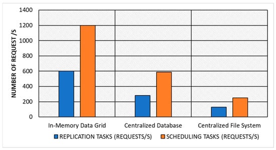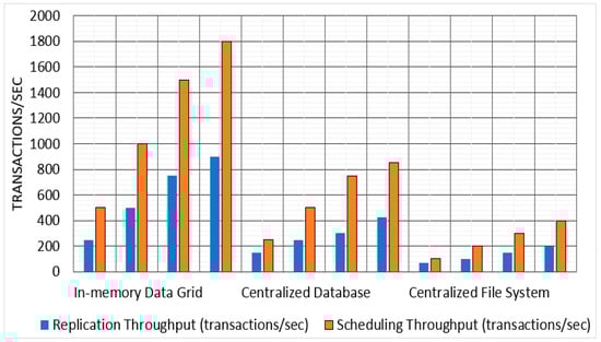 Throughput: The results of the experiments demonstrate that the in-memory data grid approach is highly effective at improving throughput in comparison to the centralized database and centralized file system approaches. Specifically, the in-memory data grid approach was able to achieve up to an 80% improvement in throughput for both replication and scheduling tasks, across both small and large datasets. Table 6 and Figure 6 show the average throughput of replication and scheduling for the three approaches.