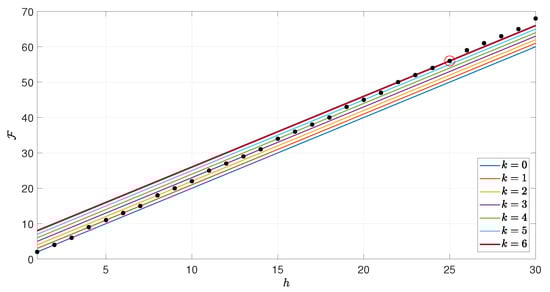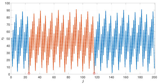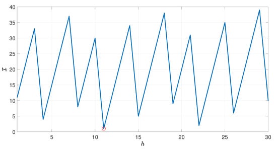 This result is confirmed by computational experiments, as one can see from Figure 1. For a better understanding of the figure, as explained in ([10], Example 4), the blue line represents the series for , starting from and with a fixed (large) integer . The red line represents the periodic part of , which arises from the critical index and (highlighted by the red circles). In this example, , so all the minima are of type , which are 2, 4, 6, 9, 11, 13, 15, 18, 20, 22, 25, and obviously, 25 is one of them. We will refer to the previous set as . It is worth noting that the 11th index of corresponds to the critical index , such that . Figure 2 shows the set for .