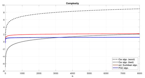 In Figure 4 we compare the complexity of our optimized algorithm (see Algorithm 2) with those of coming from the post-quantum cryptography (PQC) architecture which was estimated by Huang [29] in Matlab. More specifically, Figure 4 represents the logarithm of complexity needed to encrypt/decrypt a message with a public/private key (modulus n). As shown, our proposed algorithm, in the best case, is better than the PCQ up to .