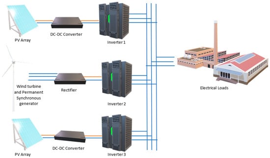 Sustainable energy is a promising solution for major challenges such as global warming, increasing demands for energy, and insufficiency of fossil fuel. Sustainable power systems are constructed of renewable energy sources, which include microturbines, photovoltaic (PV) panels, wind farms, fuel cells, combining heat and power units, etc., see Figure 1. To make full use of the renewable energies and build a sustainable power system, distributed generation (DG) is implemented. Because DG generates power near the consumers, the transmission line losses are reduced and the need for expanding the power system infrastructure will be avoided. However, the power generated from renewable energy is uncertain. This uncertainty may affect the stability of the grid. The idea of Microgrid is being studied and developed by many researchers to eliminate the disadvantages of DGs. Microgrid is a unique entity which is constructed from DGs, storage units, coordinated by a control system through communication channel. Communication system is responsible for the communication between microgrid and the energy management system, in case of communication-based control strategy of the MG [,,]. The control of the microgrid remains one of the utmost challenges facing widespread application. Master-slave control strategy has attracted many researchers because of the distribution of the control tasks among the units. Moreover, the single point of failure can be eliminated. Besides that, the current sharing is improved with proper controller design. In this paper, the master-slave control scheme is implemented. This control strategy is implemented by assigning one of the inverters as a master inverter and the other inverters as slaves. A communication network is used in this strategy which creates a networked distributed system []. The microgrid under study consists of PV array connected to the bus through DC-DC converter and an inverter, and a wind turbine with a permanent synchronous generator connected to the bus through a rectifier and an inverter. This system has been investigate in [,,,,,,]; however, the impacts of the uncertainties in the renewable energy generation has not been taken into account. The time delay present in the control loop in addition to the uncertainty brings many challenges to the controller design. In the next section we review some of the results published in the literature.