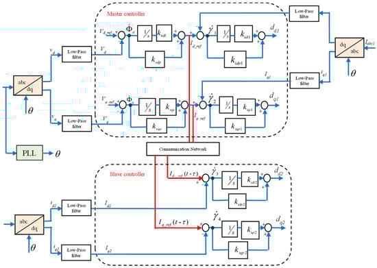 The control tasks are divided between different controllers where the voltage is regulated by the master, Figure 3. Both the master and the slave unit have current controllers but the current sharing signal is produced by the master controller []. The reference currents are distributed by the master controller to all the slave units through a kind of communications network. The reference current signals experience time delay and data loss. The model of the controllers is given by []: