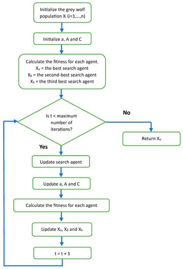 where is the number of iterations, represents the current grey wolf position, is the future position of the wolf, refers to either , , and are coefficients and given as follows.