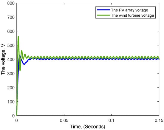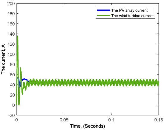 The PV array produces 45 A at 400 V, which makes the output power 18 kW. The rectifier produces 45.122 A at 410 V which makes the output power of the wind energy conversion system around 18.5 kW. To test the controller under transient and steady state, the simulation was started with zero initial conditions. The transient takes around 10 ms. The DC currents and voltages of the PV system and wind energy conversion system are shown in Figure 5 and Figure 6.