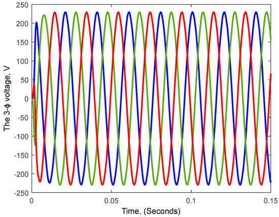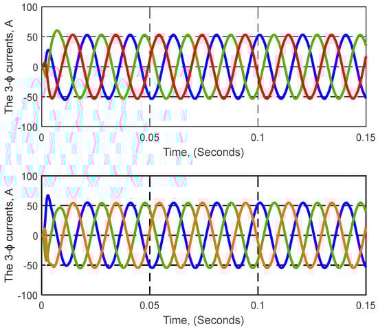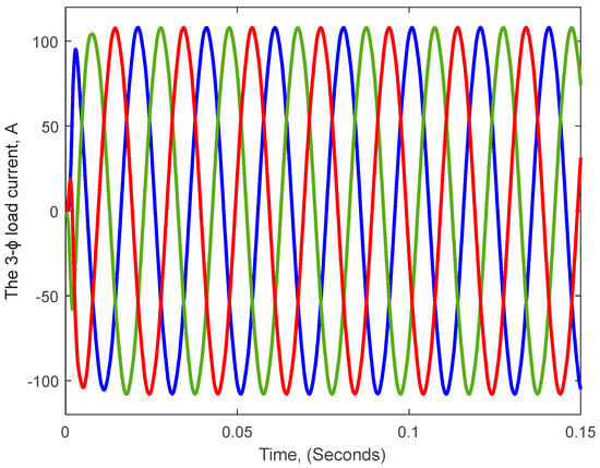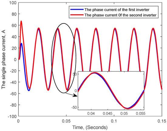 The terminal voltages of the microgrid show a stable operation and regulated voltages as can be seen from Figure 7. The two inverters produce equal three-phase currents as shown in Figure 8, and it clearly shows that the current is evenly distributed. The two inverters produce three-phase current of around 108 A as shown in Figure 9. The synchronization is carried out through PLL, and Figure 10 shows the single-phase currents of the first and the second inverter. Taking a smaller time scale (0.015 s), it is clear that the two inverters are synchronized, and we notice only small deviation during the transient condition.