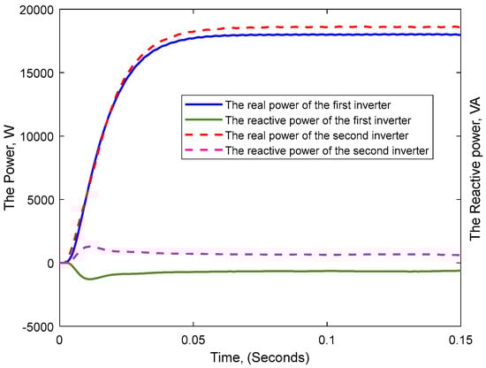 The real and reactive powers of both inverters are shown in Figure 11. The two renewable energy sources transfer their maximum produced power and supply it to the load. It should be noted that the first inverter produces the reactive power while the second inverter absorbs it. As the time delay is time varying and in most of the cases obtaining accurate model is not possible, so in this paper, the stability of the system was carried out based on Lyapunov–Krasovskii functional and H∞ robustness performance index. Another important approach is to determine the maximum delay margin of the system based on the analysis in s-domain. Based on our knowledge, this is the first time the GWO is used to design a robust controller for networked microgrid with variable time delay and uncertainties. The Speedgoat hardware-in-the-loop real-time and practical set-up will be developed to test the proposed approach.