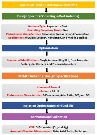 For instance, a tri-band MIMO antenna was proposed to cover the LP GSM band, WLAN band, and WiMAX band with CP [33]. In another triple-band MIMO design, the first two bands use LP, and the third band uses CP [34]. Furthermore, a meander-line pentaband MIMO antenna with circular polarization was proposed for mobile satellite services and internet-of-things applications [35]. However, despite these advancements, there is still a need to provide dual polarization that covers other frequency bands. This can be achieved through further research and development of CP MIMO antennas with high isolation, which will lead to better performance in wireless communication systems [33,34,35].